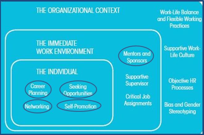Part 1 of this post, Women’s Career Development: Career Planning, Career “Contest”, Sponsorship highlighted Ines Wichart’s model of women’s career development with three levels and 11 components, based on her research as Kenexa High Performance Institute (KHPI), a subsidiary of IBM.