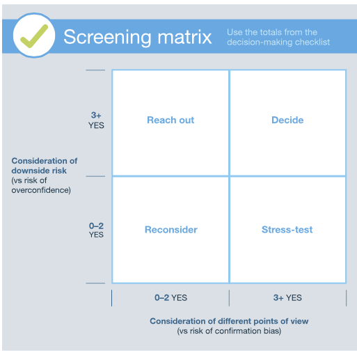 - Decide, based on inclusion of robust safeguards against both confirmation bias and overconfidence bias,